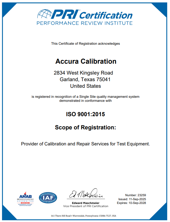 The Accura Calibration is accredited to ISO 17025 and ANSI/NCSL Z540-1, and our Quality Management System is certified to ISO 9001. All services are traceable to the National Institute of Standards and Technology (N.I.S.T).
